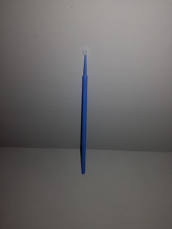 - Dünne, blaue Stäbchen mit leicht biegsamer und fusselfreier Tupfer-Spitze (fein)