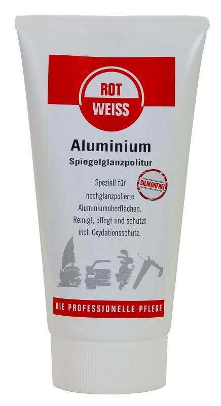 150 ml Tube Die ROTWEISS Aluminium -Spiegelglanzpolitur bringt für unbehandeltes Aluminium, spiegelnden Hochglanz und schützt vor Oxydation. Die Aluminiumpolitur ist silikonfrei. Politur auf ein weiches Tuch geben und das Teil kreisförmig einreiben, bis es sich anschwärzt. Danach mit einem sauberen Baumwolltuch nachpolieren. Sehr gut haben sich zum Polieren ROTWEISS Polierfäden bewährt.